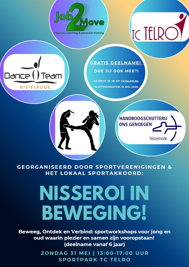Nisseroi in Beweging staat in het teken van samen bewegen en kunt u kennis maken doormiddel van korte workshops o.a. tennis en padel, bootcamp, bewegen op muziek/dans, weerbaarheidstraining en handboogschieten. Alle workshops vinden plaats op het park van TC Telro en daaromheen.